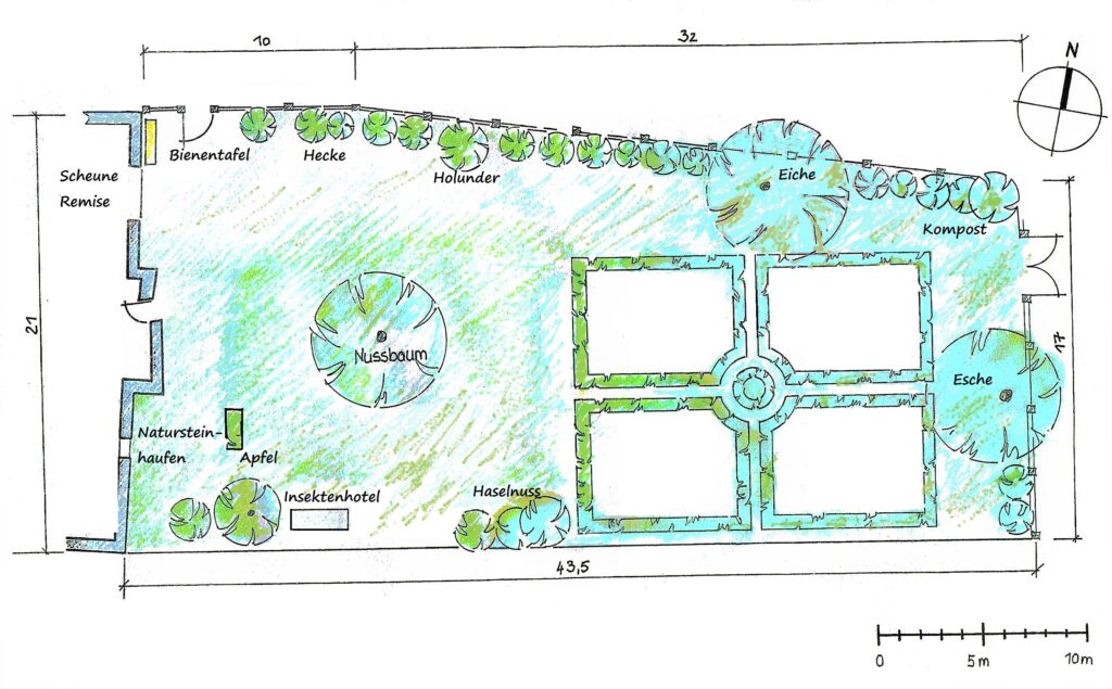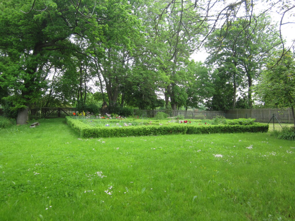 Das ca. 860 Quadratmeter großes Areal unmittelbar hinter der Scheune ist mit alten Haselnuss- und Holunderbüschen, einem Walnussbaum, Eschen und einer Eiche bestanden. Ab August 2006 wurde mit Hilfe von Fördermitteln des Europäischen Sozialfonds zur Beschäf-tigungsentwicklung (LOKAST) einen Bauerngarten nach historischem Vorbild angelegt, bei uns ein reiner Blumen- und Kräutergarten.
