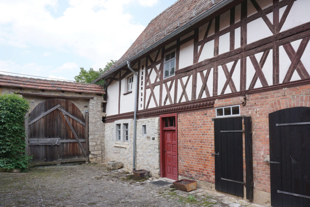 Das älteste Gebäude des Hofs ist das mit einer Inschrift auf das Jahr 1599 datierte Wohnstallhaus. Daran schließt die Torfahrt an, neben der mit einer deutlich sichtbaren Baufuge ein Renaissance-Sitznischenportal angefügt wurde. Diese Anordnung erscheint unlogisch, da die Pforte im Regelfall an das Wohnhaus anschließt. Bei genauerer Betrachtung wird auf der Rückseite der Torfahrt zum Haus hin der Ansatz eines Segmentbogens sichtbar, dessen Gegenseite sich in der heutigen Stubenwand befindet. Hier stand also vor dem Bau des heutigen Hauses ein Portal. Das Wohnstallhaus ist zweigeschossig und besitzt ein Erdgeschoss in Massivbauweise. Das Obergeschoss ist in Fachwerkbauweise errichtet, der Dachstuhl als Kehlbalkendach ausgeführt.